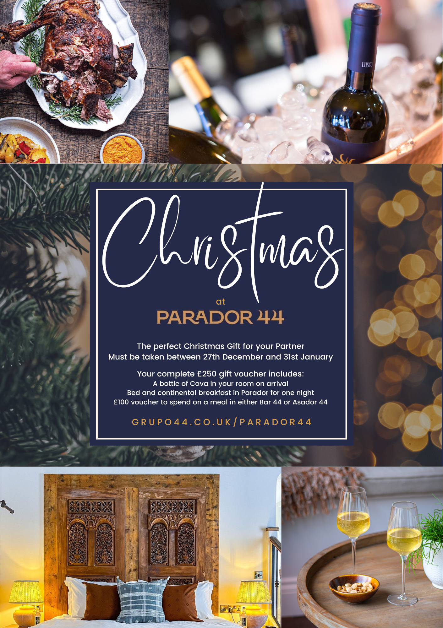 A perfect Christmas gift for your partner!Your Parador 44 Christmas Voucher gives the recipient bed and breakfast for one night in Parador 44, with a bottle of Cava in your room on arrival, bed and breakfast in Parador for one night, and £100 voucher to spend on a meal in either Bar 44 or Asador 44.